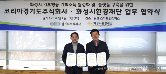 경기도주식회사는 13일 성남 판교 스타트업캠퍼스에서 화성시환경재단과 ‘기후행동 기회소득 활성화 및 화성시 플랫폼 구축을 위한 업무협약(MOU)’을 체결했다고 밝혔다. 이날 협약식에는 이재준 경기도주식회사 대표이사와 정승호 화성시환경재단 대표이사 등 주요 관계자 10여 명이 참석했다.