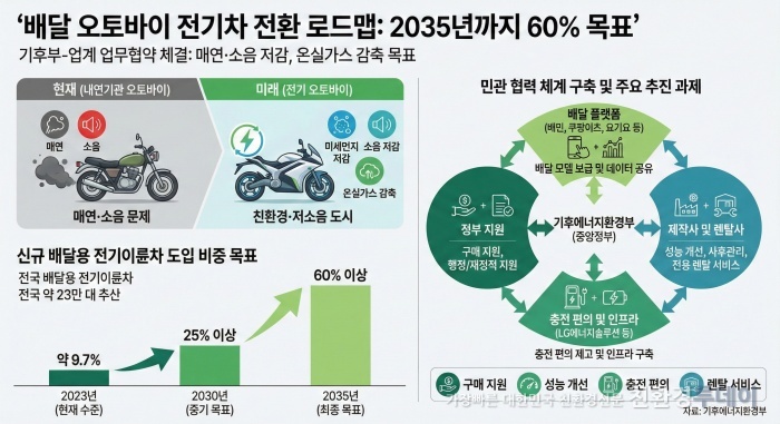 정부가 도심 내 배달 오토바이의 고질적인 매연과 소음 문제를 해결하기 위해 2035년까지 신규 배달용 이륜차의 60% 이상을 전기 이륜차로 전환하기로 했다. 이를 위해 주요 배달 플랫폼 및 제작사와 손잡고 대대적인 보급 확대에 나선다.