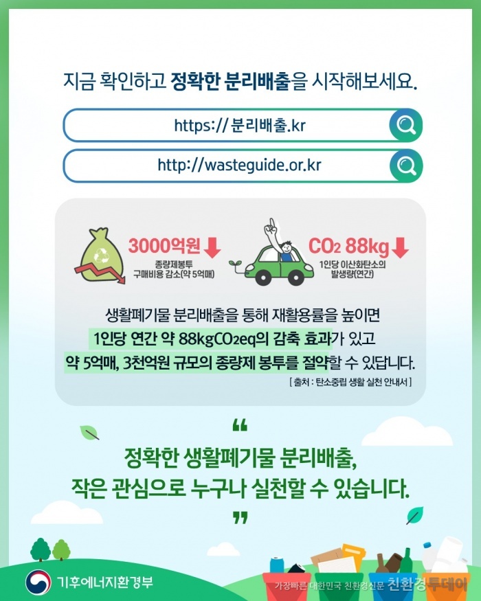 스마트폰으로 누리집에 접속하면 위치 정보를 기반으로 우리 동네(시군구별) 배출 방법과 장소까지 지도 형태로 확인할 수 있다. 기후에너지환경부 자원순환국장은 "잘못된 정보가 퍼지면 정책의 실효성이 떨어진다"며 "카드뉴스 배포 등을 통해 '생활폐기물 분리배출 누리집' 홍보를 강화하겠다"고 밝혔다.