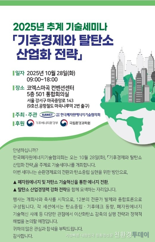 한국폐자원에너지기술협의회가 오는 10월 28일 서울 코엑스마곡 컨벤션센터에서 '기후경제와 탈탄소 산업화 전략'을 주제로 '2025년 추계 기술세미나'를 개최한다. 이번 세미나는 탄소중립 실현과 기후 경쟁력 강화를 위한 기술혁신 방안을 논의하고 산업계의 발전 방향을 모색하기 위해 마련됐다. 개회식에는 한국폐자원에너지기술협의회 박진원 회장의 개회사를 시작으로 기후에너지환경부 폐자원에너지과 이제훈 과장 등이 참석해 기후경제와 탈탄소 기술정책의 중요성을 강조할 예정이다.