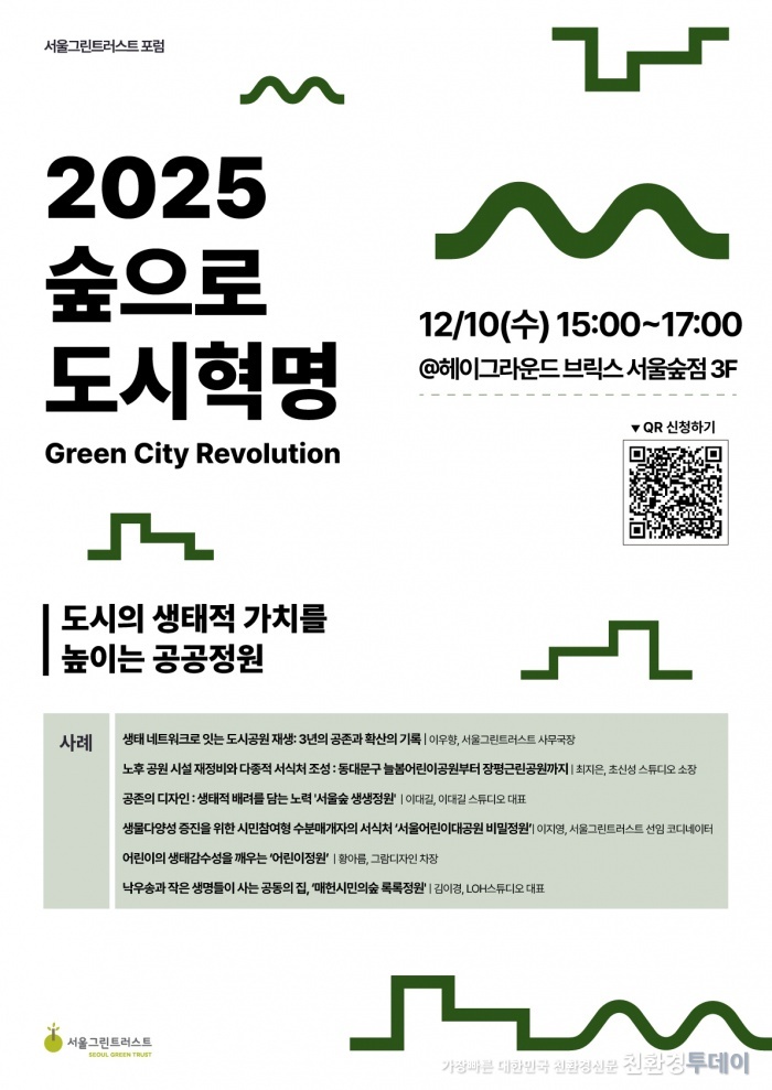 서울그린트러스트가 오는 12월 10일 헤이그라운드 브릭스 서울숲점에서 '제5회 숲으로 도시혁명 - 도시의 생태적 가치를 높이는 공공정원' 포럼을 개최한다. '숲으로 도시혁명'은 2018년부터 도시의 기후·생태 위기를 주제로 지속가능한 공원과 녹지의 역할을 논의해 온 서울그린트러스트의 대표 포럼이다. 3년 만에 열리는 이번 포럼은 '서울그린비전 2040' 실천의 일환으로, 지난 3년간 추진해 온 '지속가능한 공원 프로젝트'의 구체적인 성과를 공유하고 공공정원의 새로운 방향을 제시한다.