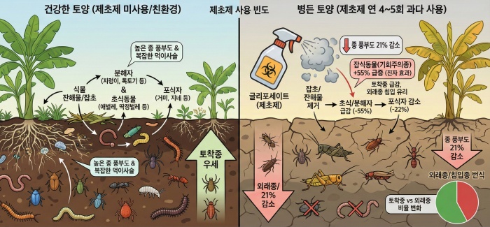 특히 생태학적으로 가장 우려되는 대목은 제초제 사용이 토착종과 외래종의 서식 구성 비율을 극적으로 뒤바꿔놓았다는 점이다. 제초제를 사용하지 않은 농경지에서는 토착 곤충과 거미류의 비중이 높게 유지되었으나, 연 4~5회 제초제를 사용한 곳에서는 토착 거미류와 개미류의 비율이 각각 55%, 75%까지 급감했다. 결과적으로 제초제에 의해 식생 덮개와 잔여물이 일시에 제거된 교란 환경이, 높은 분산 능력과 척박한 미기후 환경에 대한 내성을 갖춘 외래 침입종에게 더욱 유리한 서식 및 생존 조건을 제공한 셈이다. 연구진은 제초제와 외래 침입종이라는 두 가지 생물다양성 위협 요인이 상호 시너지를 일으켜 전 세계적인 생태계 파괴를 가속할 수 있다고 경고했다.