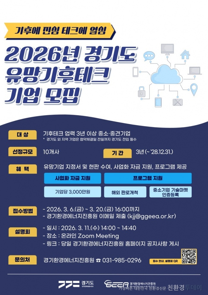 경기도와 경기환경에너지진흥원이 기후위기 대응을 선도할 혁신 기술 보유 기업을 발굴하기 위해 오는 20일까지 '2026년 경기도 유망 기후테크 기업' 10곳을 모집한다.